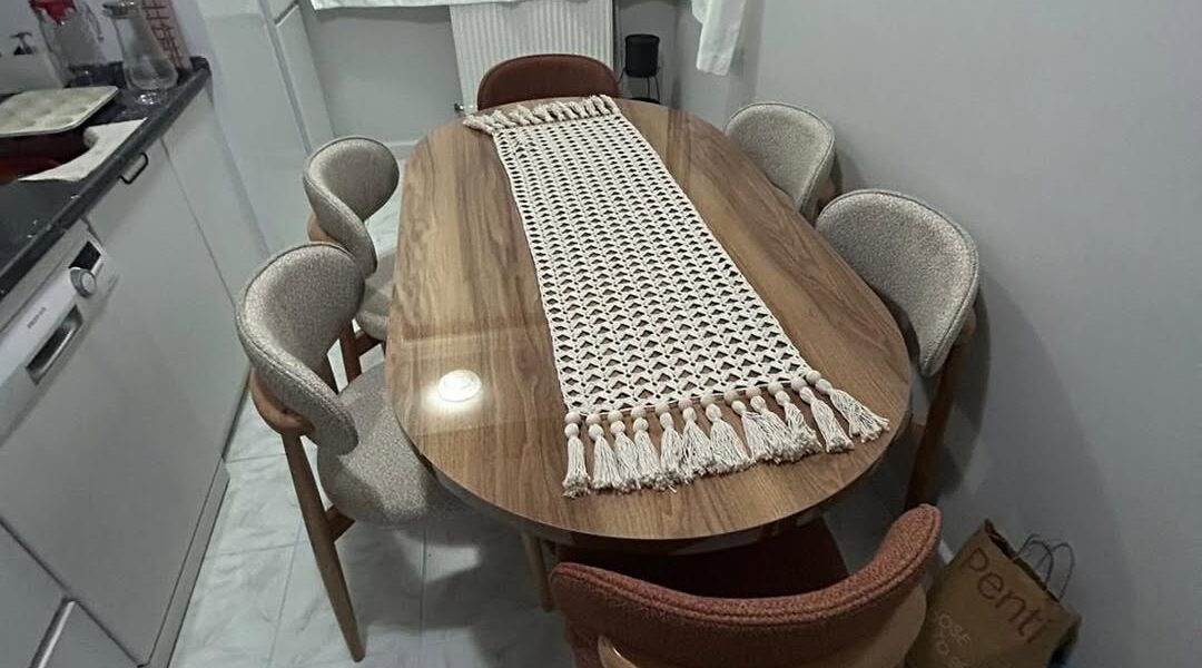 Aksesuar: Üzerindeki el örgüsü makrome (veya benzeri) tarzı bej runner, masaya rustik ve bohem bir dokunuş ekliyor.