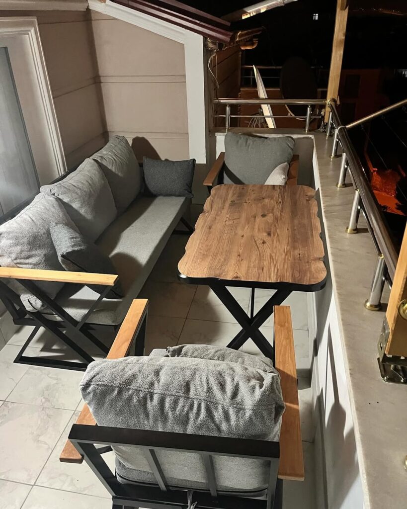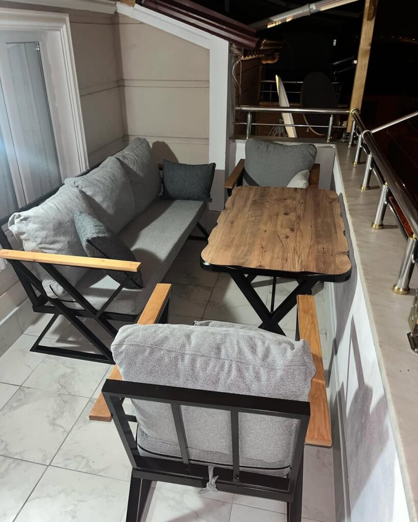 - Yüksek Konfor: Kalın, gri minderler maksimum oturma konforu sunar. Dış mekan kumaşı kolay temizlenir ve hava şartlarına karşı dayanıklıdır.