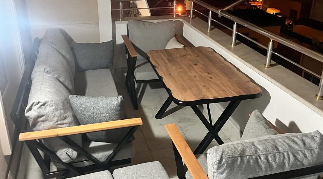 Ahşap yüzeyli sehpa ve gri minderli metal iskeletli modern balkon oturma grubu 4 kişilik.modern-balkon-oturma-grubu-metal-ahsap